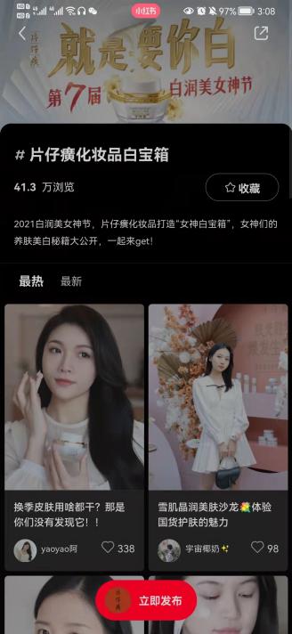 除了在情感上向女性朋友温情告“白”,此次白润美女神节,片仔癀化妆品也希望能够在生活中帮助女性走向“白润美”的女神之路。于是,片仔癀联手小红书上线了#片仔癀化妆品白宝箱#话题,与渴望变美的消费者直接对话,借助更专业、更有影响力的意见领袖们之口,道出片仔癀雪肌系列产品“草本养肤”的理念,展现其“养肤美白”的产品魅力。