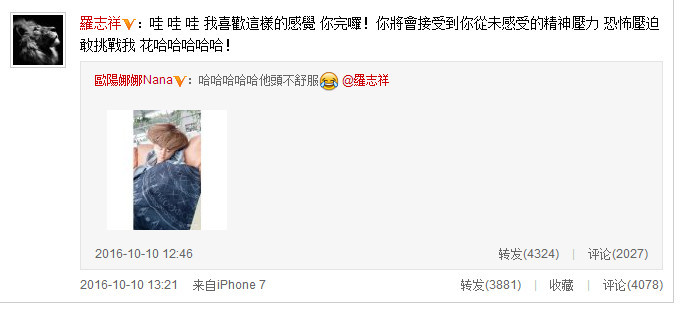 罗志祥也转了自己的这张大头照,还玩笑般地威胁欧阳娜娜:“你完咯!”开得起这种玩笑,关系一定是非常亲密的了。